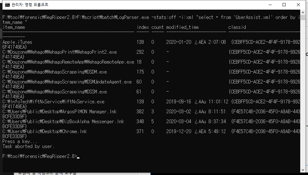 F:\>F:\script\batch\LogParser.exe -stats:off -i:xml "select * from 'UserAssist.xml' order by item_name "