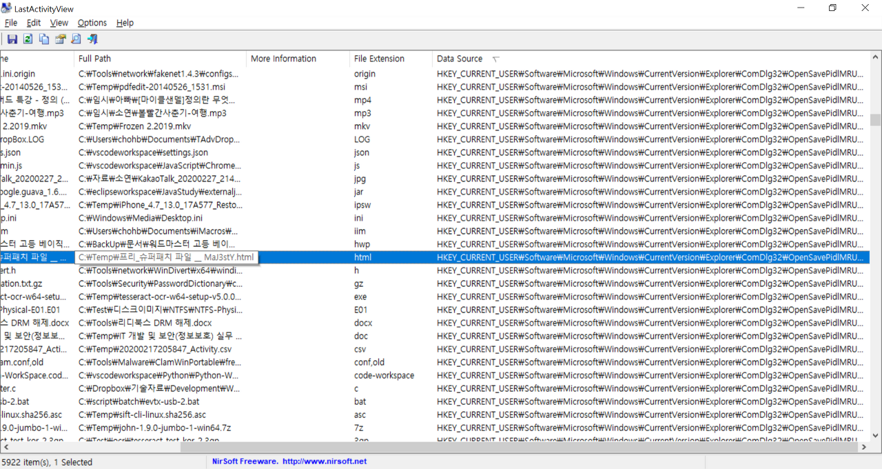 Data Source를 보면 OpenSavePidlMRU, LastVisitedPidlMRU 등 레지스트리도 추출하여 표시한다.