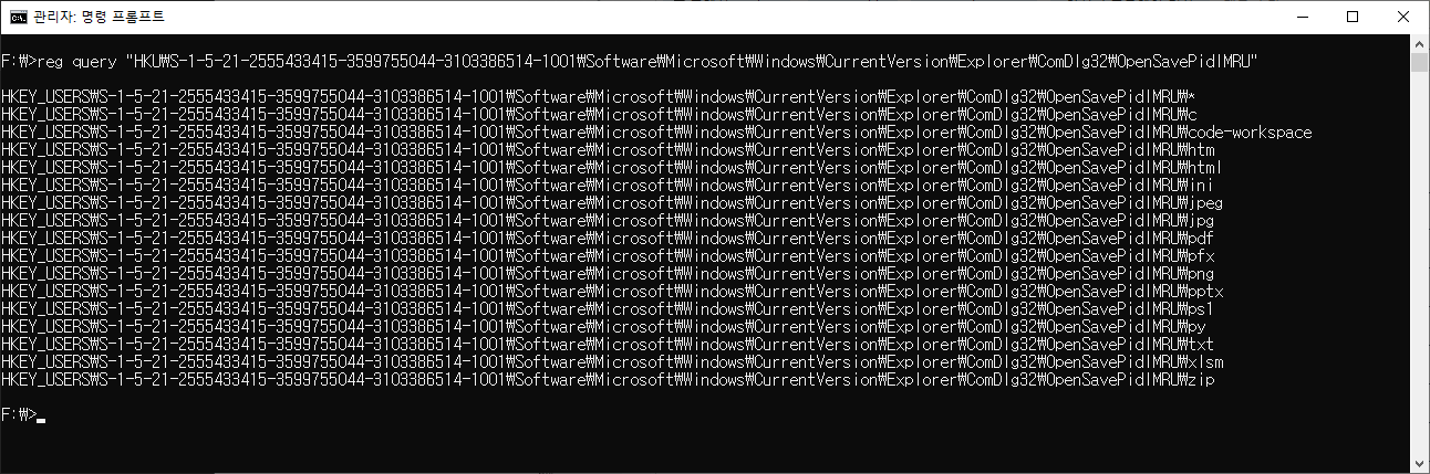 F:\>reg query "HKU\S-1-5-21-2555433415-3599755044-3103386514-1001\Software\Microsoft\Windows\CurrentVersion\Explorer\ComDlg32\OpenSavePidlMRU"
