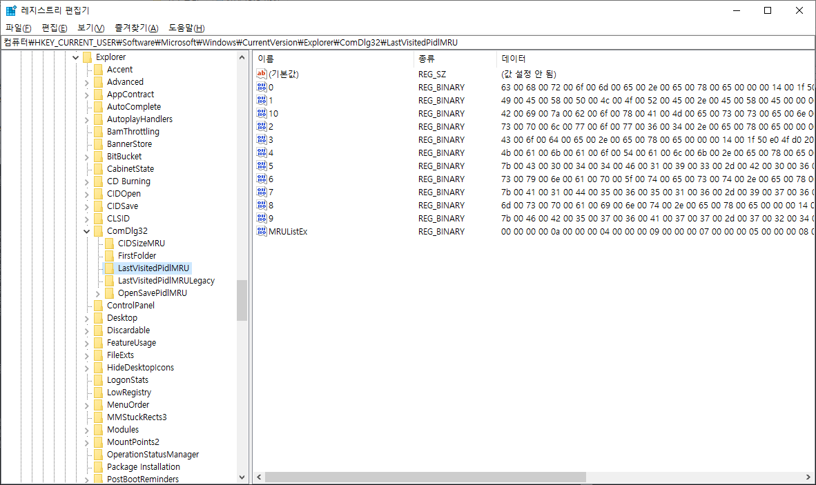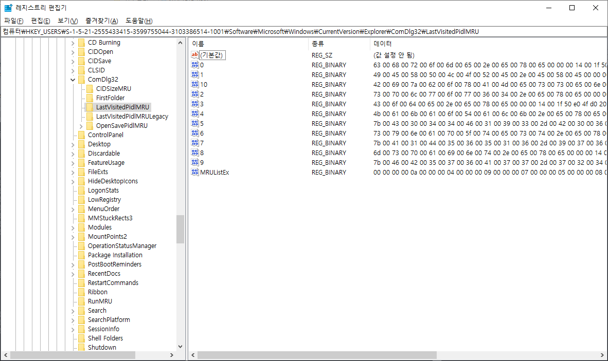 LastVisitedPidlMRU 키는 응용프로그램에서 파일을 열기 위해 사용하는 특정 실행 파일을 추적합니다.