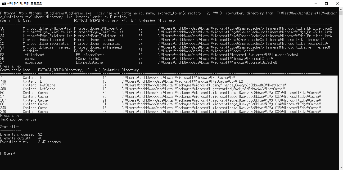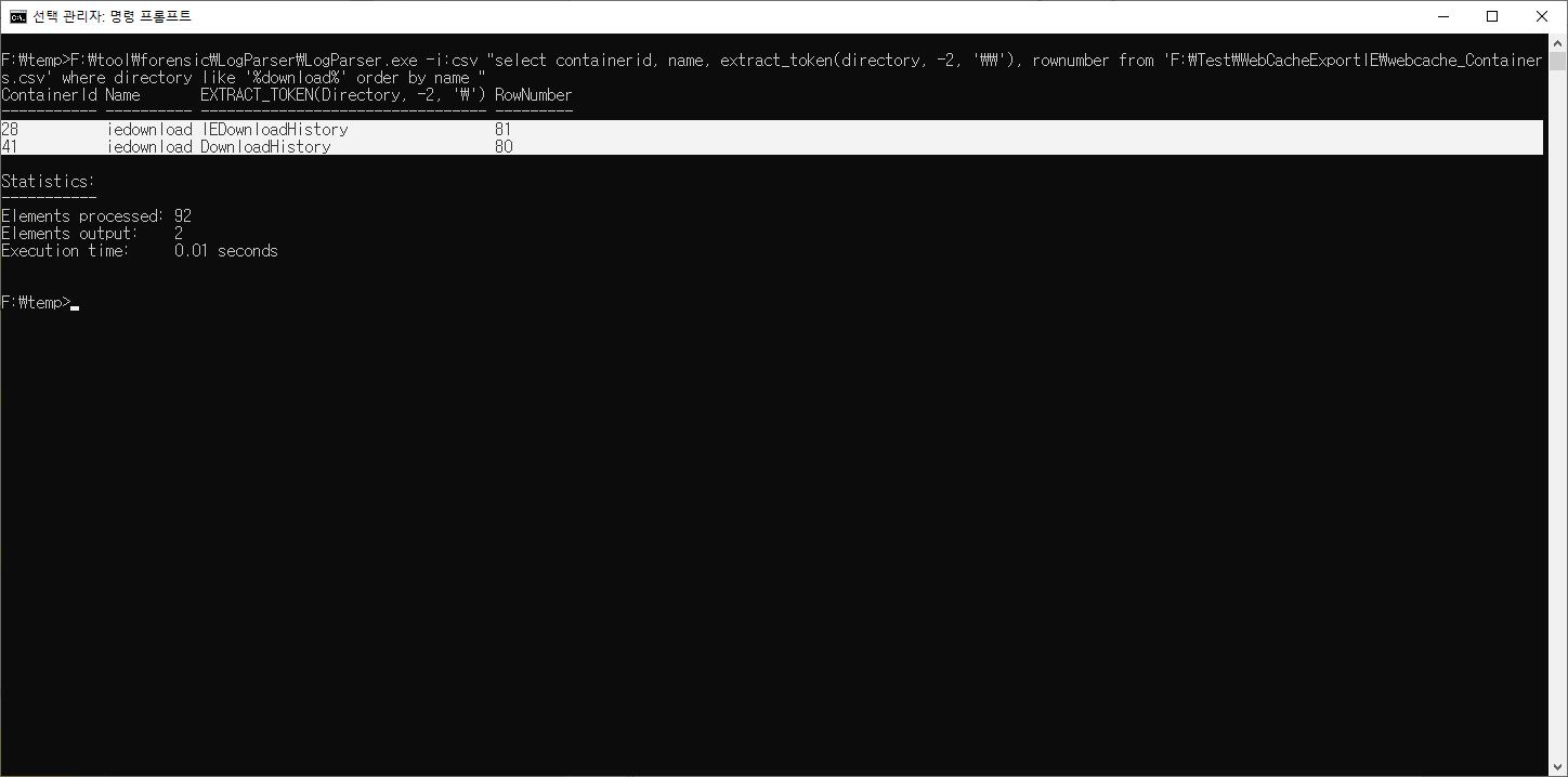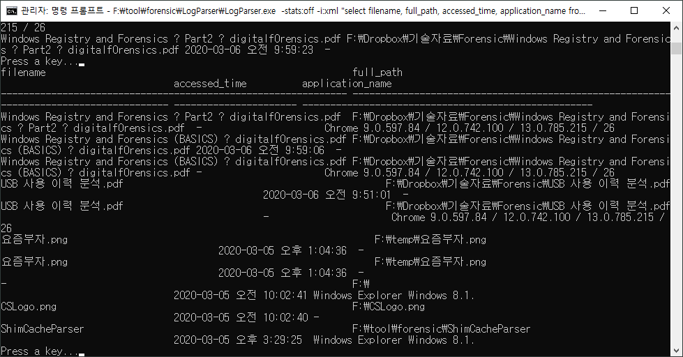 F:\tool\forensic\jumplistsview>F:\tool\forensic\LogParser\LogParser.exe -stats:off -i:xml "select filename, full_path, accessed_time, application_name from 'F:\temp\JumpList.xml'"