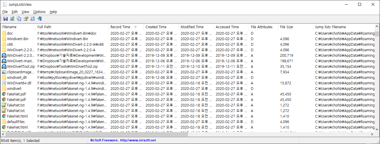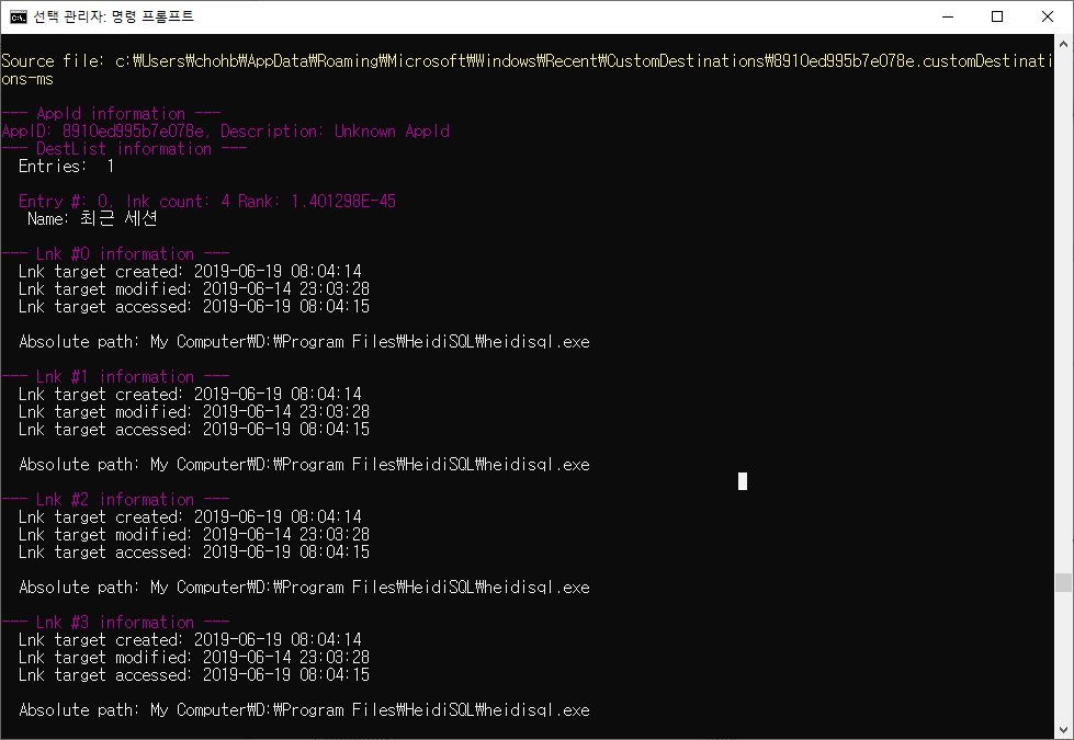 F:\tool\forensic\jumplistsview>F:\tool\forensic\JLECmd.exe -d c:\Users\chohb\AppData\Roaming\Microsoft\Windows\Recent\CustomDestinations all