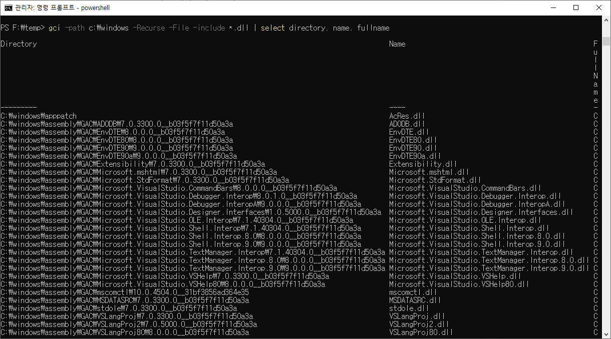 PS F:\temp> gci -path c:\windows -Recurse -File -include *.dll | select directory, name, fullname