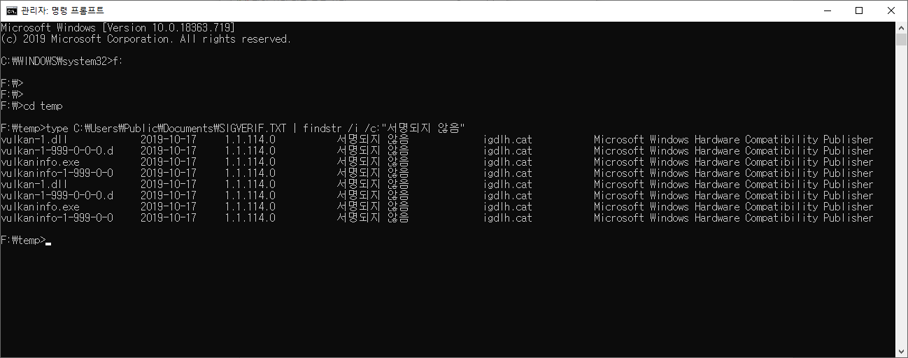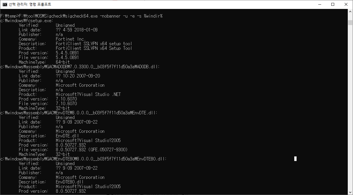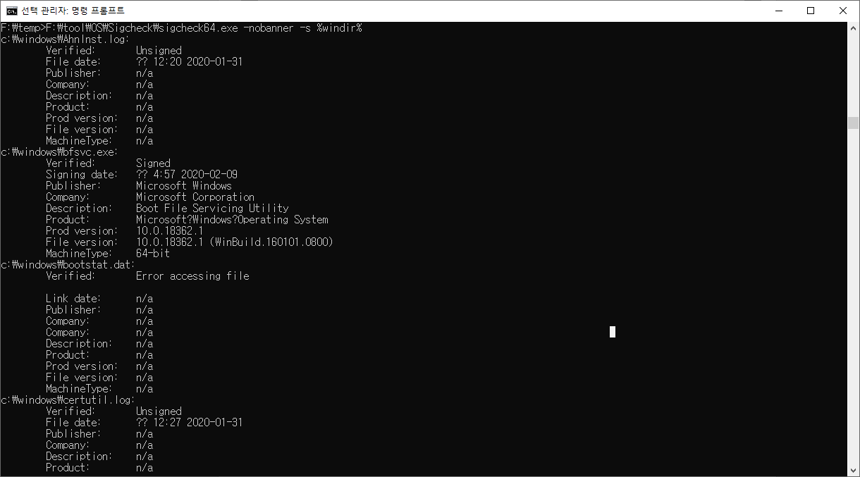 F:\temp>F:\tool\OS\Sigcheck\sigcheck64.exe -nobanner -s %windir%