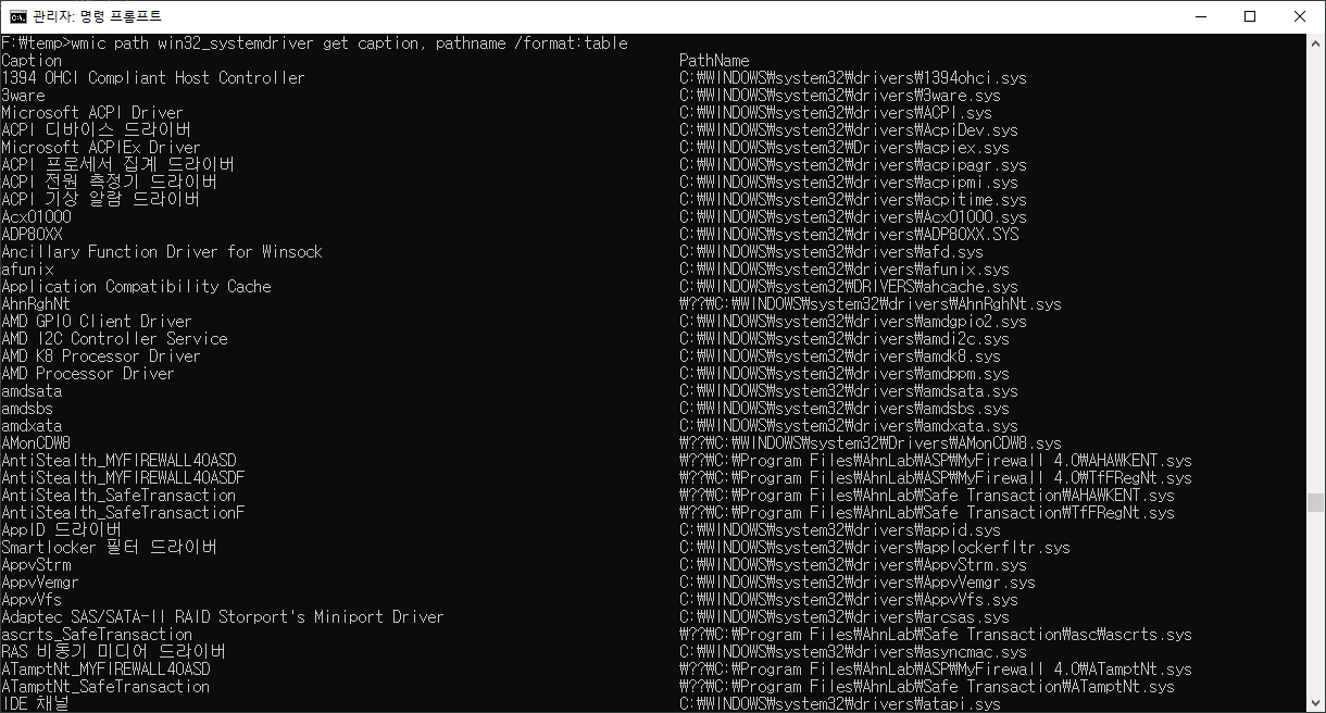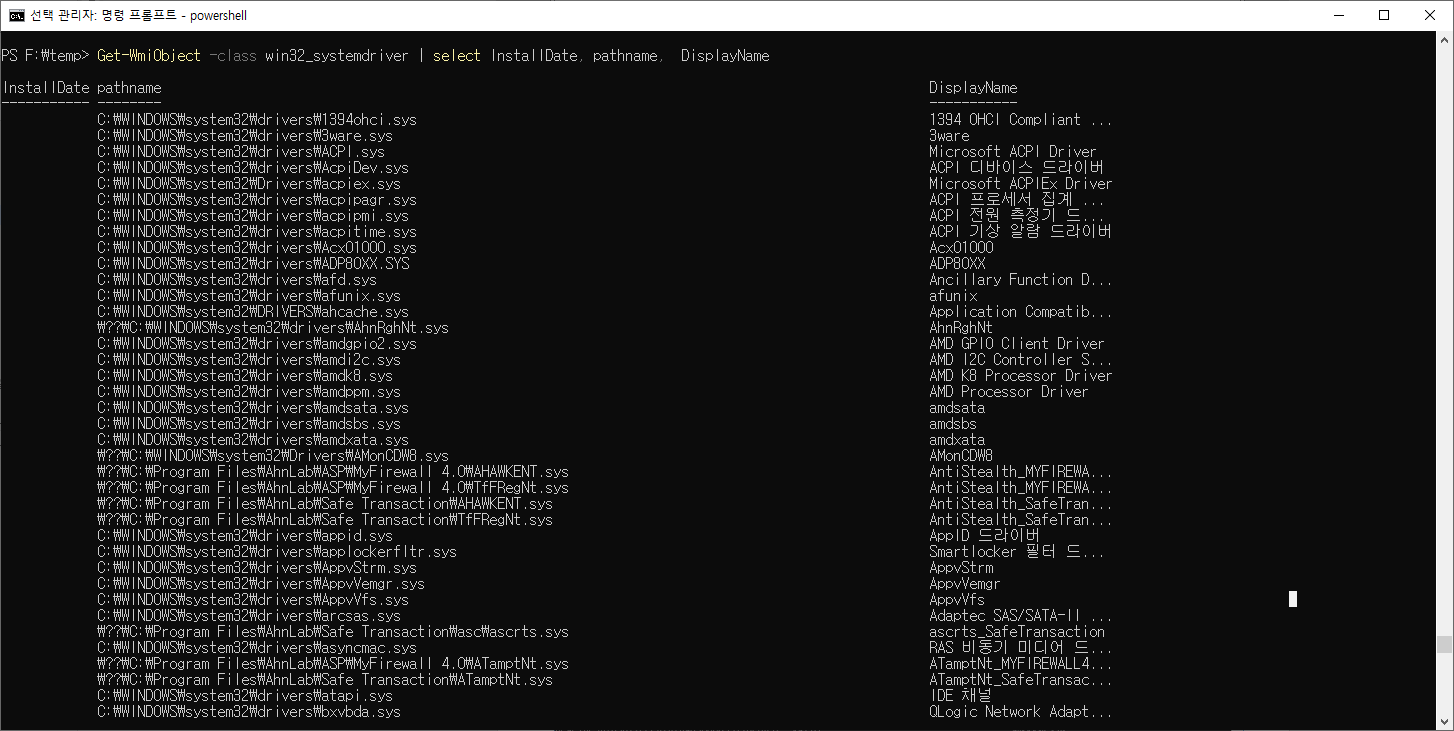 F:\temp>wmic path win32_systemdriver get caption, pathname, installdate /format:table