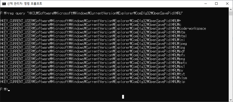 F:\>reg query "HKCU\Software\Microsoft\Windows\CurrentVersion\Explorer\ComDlg32\OpenSavePidlMRU"